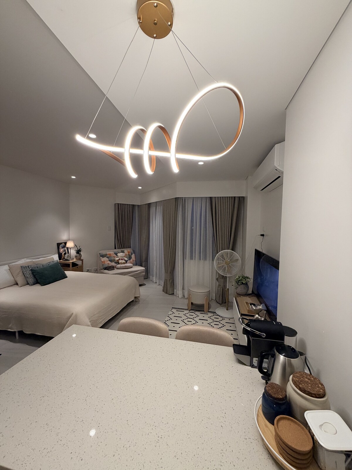 Добро пожаловать в ваш расслабляющий ретрит в центре курорта Tambuli Seaside Resort — единственного жилого курорта в Себу с прямым доступом к пляжу! Эта стильная студия идеально подходит для пар, цифровых кочевников или одиночных путешественников, ищущих комфорт, удобство и прибрежное очарование. Наслаждайтесь двуспальной кроватью размера Queen size, кофемашиной, Netflix, Wi-Fi 300 Мбит/с, полностью оборудованной кухней и спокойным балконом с видом на сад. Уютное жилье для удаленной работы или отдыха.