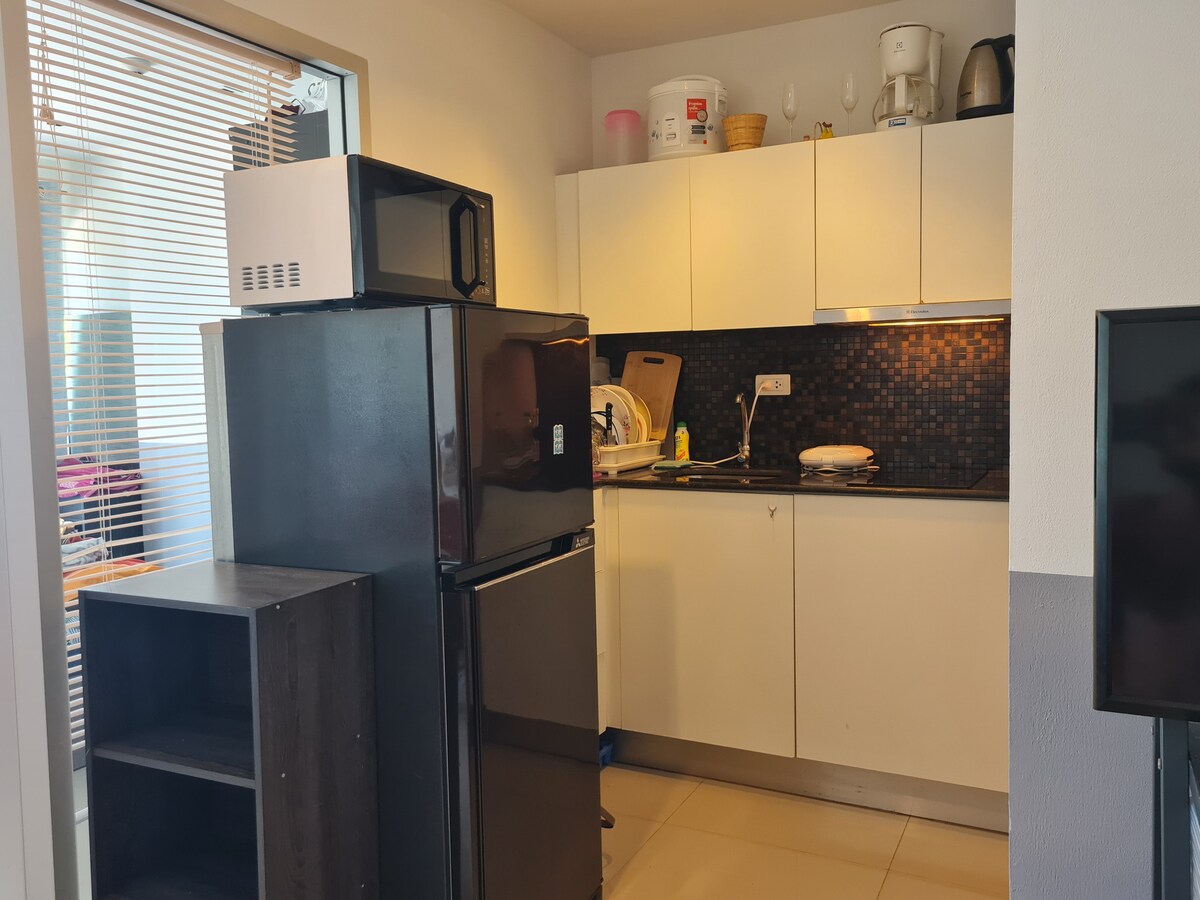 Прямо на пляже! Красивая современная квартира-студия (40 кв. м) на первом этаже, кухня в западном стиле с индукционной плитой, полное кухонное оборудование, сковороды, посуда, столовые приборы и большой холодильник. Большая удобная кровать (размер King size), большой шкаф с раздвижными дверями, ванная комната с раковиной и душем с горячей водой. Кроме того, есть большой телевизор Smart TV (55) и балкон со столом и 2 стульями и прямым видом на бассейн и море. Конечно, Wi-Fi включен в стоимость.