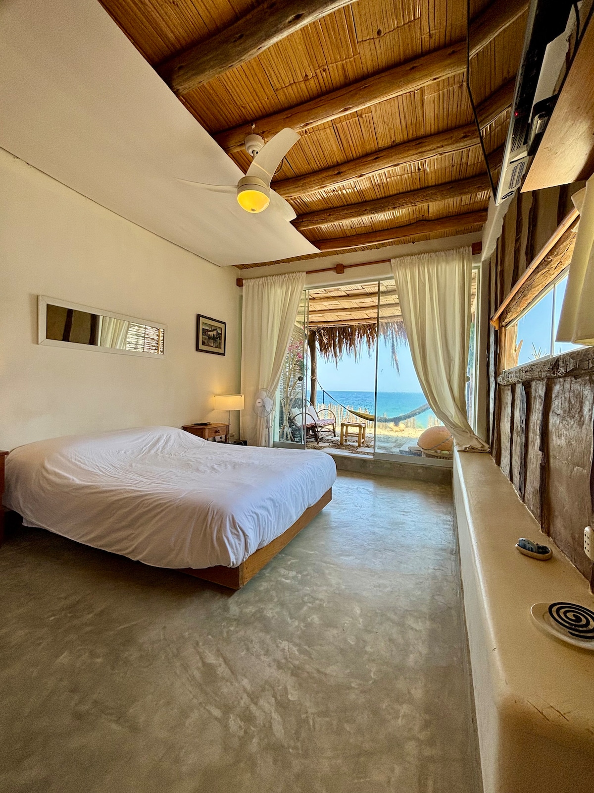 Наслаждайтесь видом на океан из нашего бунгало Редондо, оформленное в морском стиле, в современном стиле. ⚓ Расслабьтесь в двуспальной кровати размера King size, наблюдая закат или фильм Netflix на большом телевизоре 🛏️📺 Собственная 🛁 ванная ❄️ FrioBar Общая 🍳 🍖 кухня Ужин 🍝 на свежем воздухе Бунгало расположено на холме в Лос-Органосе, указывающее на Малекон и Пуэрто ⛵ Мы гарантируем самые впечатляющие восходы и закаты солнца на севере Перу. 🌅
