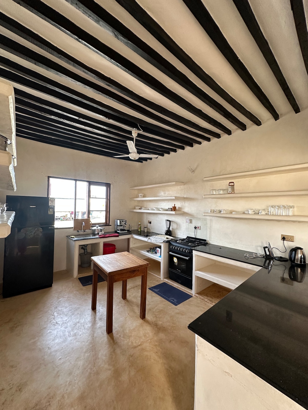 Гостиная и обеденная зона открытой планировки — это сердце дома. Они находятся под традиционной крышей из макути и окружены зеленью. Наслаждайтесь едой в гостиной на встроенных диванах или работайте удаленно с легкостью. Открытая кухня полностью оборудована для самостоятельного приготовления пищи. А под открытым небом можно принять освежающий душ — идеально после пляжа или ленивого дня на солнце. Дизайн жилья, сочетающего в себе архитектуру суахили и яркий островной стиль, продуман до мелочей.