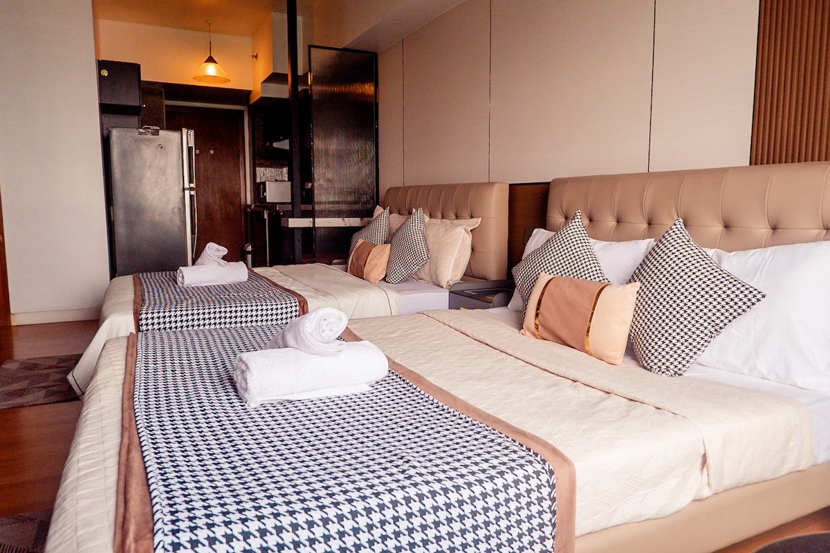 Добро пожаловать в наш полностью отремонтированный современный кондоминиум, расположенный в Maui Tower Azure Urban Residences & Resort. В квартире площадью 50 кв. м есть балкон и 2 спальни, в которых могут разместиться до 6 гостей. ✔ 1 двуспальная кровать в спальне хозяина ✔ 1 двуспальная кровать с односпальной раскладной кроватью в спальне гостя; ✔ 1 диван (с двумя односпальными кроватями) в гостиной. Классическая телевизионная приставка✔ Xiaomi M8 Pro с 2 контроллерами + 20 000 многопользовательских игр Колонка ✔ Samsung ✔ 43-дюймовый HD-телевизор Smart TV Вход ✔ Смарт замок ✔ Караоке