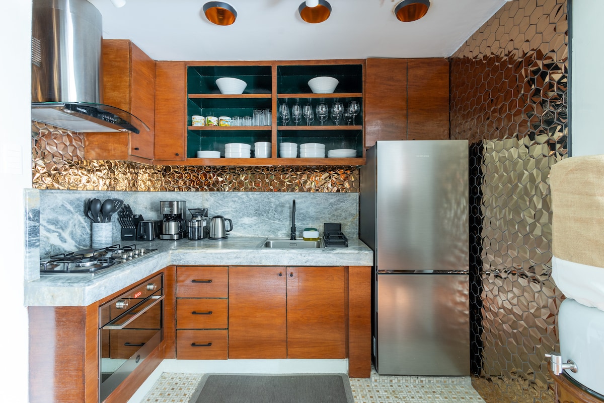 Open the complimentary wine and listen to music via retro Marshall speakers. Here custom wood furniture meets textured concrete walls, plush Persian carpets, classic vintage pieces and 60s pop art accents. A refined fusion of industrial and retro features ultimately lends this loft its unique, special character. Perfect for a photogenic boutique art hotel vibe. A fantastic option for business travel and couples with discerning taste, looking to stay in one of Manila’s most premium locations.