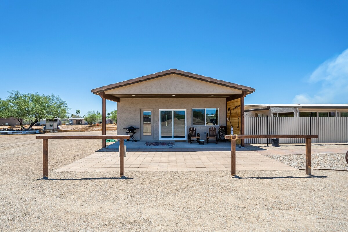 Enjoy the private, peaceful Cowboy Casita. A guest house in a desirable Apache Junction neighborhood close to the US-60 and situated in the shadows of the Superstition Mountains. Near trails, parks, entertainment venues, and shopping. This unique guest house lives large for 1-BR 1-BA floor plan. Recently built, with stylish industrial interior design. Location is 0-10 min. from world-class hiking, and local attractions. RV spot with full hook ups available on property.