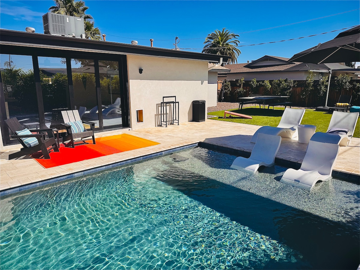 В Revolution Retreat есть совершенно новый бассейн с подогревом, травертиновой плиткой и задним двором. Жилье спроектировано с открытой планировкой этажа и уникальным стилем, создающим идеальное пространство для отдыха. Он расположен в 3 милях от Старого города Скоттсдейла и в 15 минутах от аэропорта, так что вы находитесь прямо в центре всех основных достопримечательностей долины. В доме с комфортом может разместиться до 10 гостей. (Обратите внимание, что бассейн может подогреваться за отдельную плату, подробности ниже)