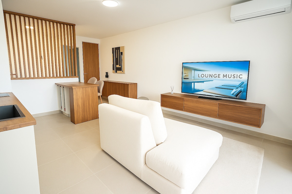 Откройте для себя нашу красивую пляжную студию площадью 40 кв. м с потрясающим видом на море, простирающуюся до самого глаз. Этот яркий кокон, расположенный немного приподнятый, предлагает уникальную перспективу, погружая вас в спокойную и успокаивающую обстановку, где шум волн успокаивает вас от восхода солнца. Внутри студия продумана, чтобы сочетать комфорт и простоту. Вы найдете светлую главную комнату с большими окнами от пола до потолка с видом на море.