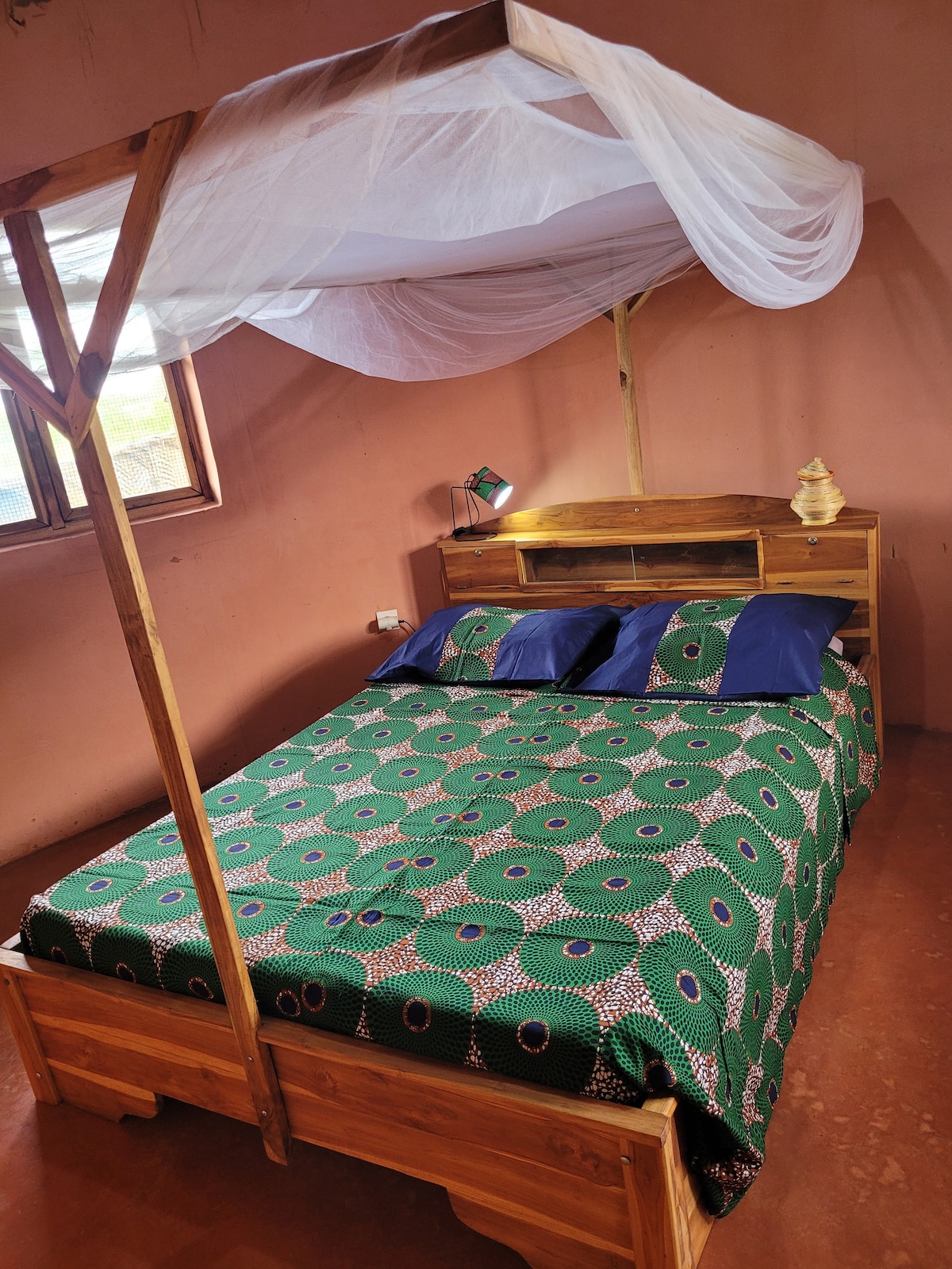 Cet oasis vous accueille dans 5 cases faites de briques de terre crue et paille. C'est un cocon pour se ressourcer et se détendre en brousse africaine. Chaque case possède une chambre avec 1 lit de 2 personnes (matelas européen), 1 penderie, 1 rangement avec fermeture par clef, 1 ventilateur électrique, 1 salle d'eau avec WC sec et 1 terrasse privée avec fauteuils et table. A 10mn à pied, la lagune et sa plage vous attende. A 15mn en voiture, Aneho vous ravira par sa plage, sa douceur.
