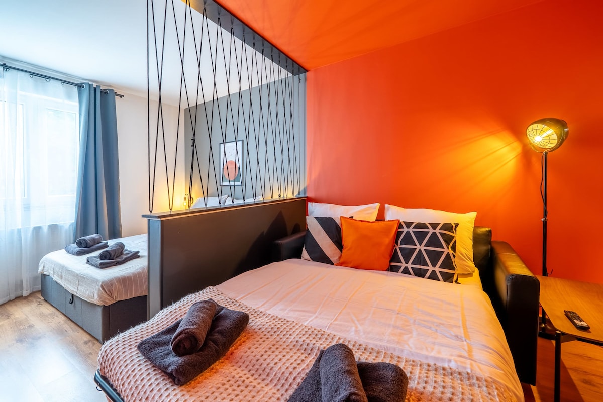 Добро пожаловать в CASE Apartments Marl: стильные студии в индустриальном шике, расположенные в центре города рядом с пешеходной зоной, но тихие – с собственной кухней, умным телевизором, быстрым Wi-Fi и бесплатной парковкой прямо у дома. Доступно на первом этаже. Современная прачечная со стиральными машинами, сушилками и утюгами доступна для всех гостей. До супермаркетов, ресторанов можно дойти пешком — идеально подходит для деловых поездок и длительного проживания! Химический парк Марл находится в нескольких минутах езды на машине.