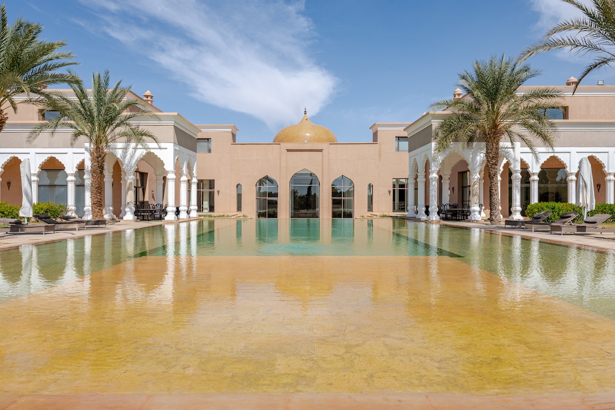 Experience a unique stay in an exceptional palace with five luxurious suites near Marrakech. This peaceful haven, nestled in the heart of a lush park, offers breathtaking panoramic views of the Atlas Mountains, visible from its elegant pool, terraces, and gardens. Ideally located on the road to the Ourika Valley, this prestigious residence, inspired by Persian and Arabo-Andalusian influences, promises an unforgettable stay to be shared with family or friends.