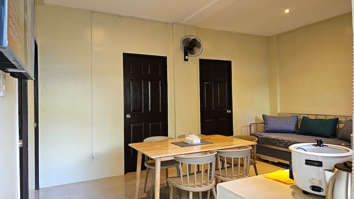 Полностью меблированная квартира с 1 спальней с кондиционером и кухней и посудой для приготовления пищи, духовкой, чайником, утюгом и доской, большим плоским кабельным телевидением и Netflix, горячим и холодным душем,бесплатным Wi-Fi. Комната расположена на первом этаже трехэтажной квартиры,подходящей для пожилых людей. Она находится в 5 минутах от центра города/крупных торговых центров. Также есть терраса на крыше с величественным видом на Майон. Плата за раннее прибытие (350 P) при заселении до 10:00.