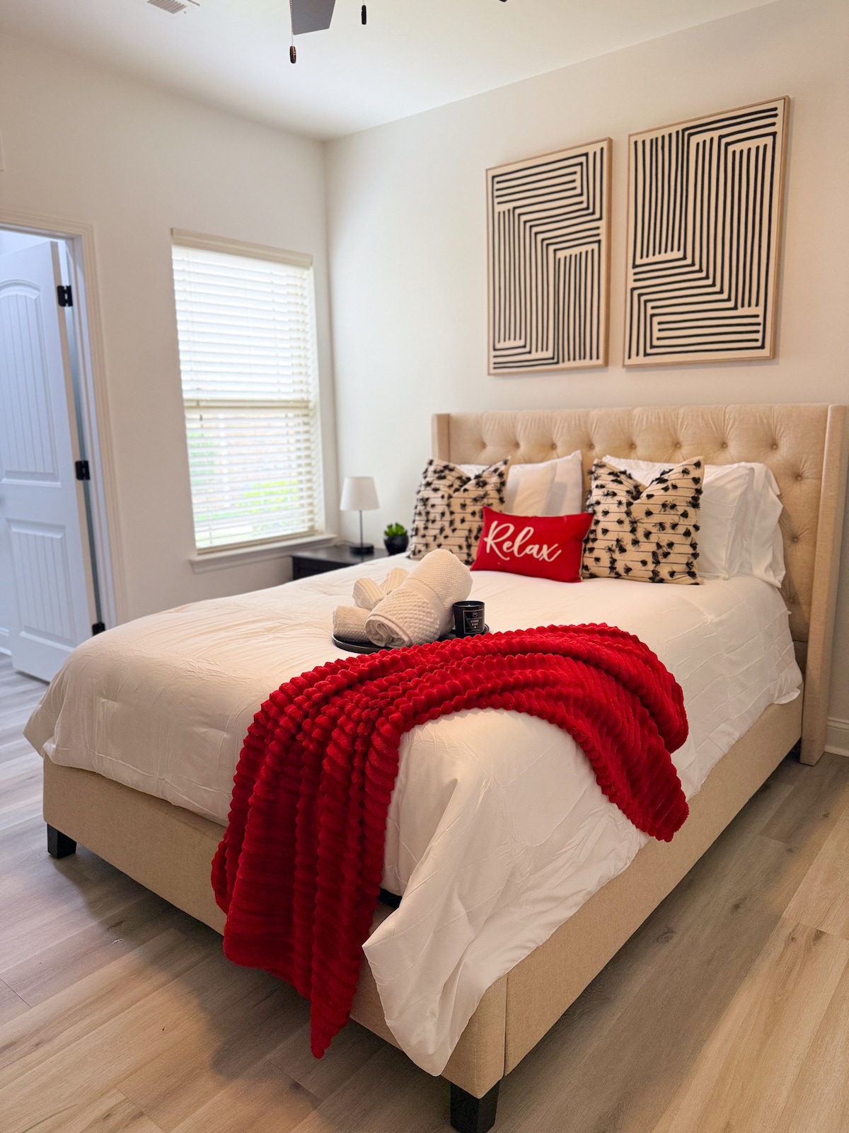 Добро пожаловать в ваш уютный дом в The Banks at RiverGate, современная квартира с 1 спальней, идеально расположенная всего в 5 милях от международного аэропорта Шарлотт Дуглас. Независимо от того, путешествуете ли вы по работе или на отдых, этот продуманно спроектированный дом станет идеальным местом для вашего пребывания в Шарлотте. Жилье: Кровать размера Queen size — спокойно выспитесь в мягкой кровати размера Queen size с мягким постельным бельем и стильным декором. Гостиная: светлая, открытая планировка с шикарным черным кожаным диваном, телевизором со smart-каналами и современными произведениями искусства!