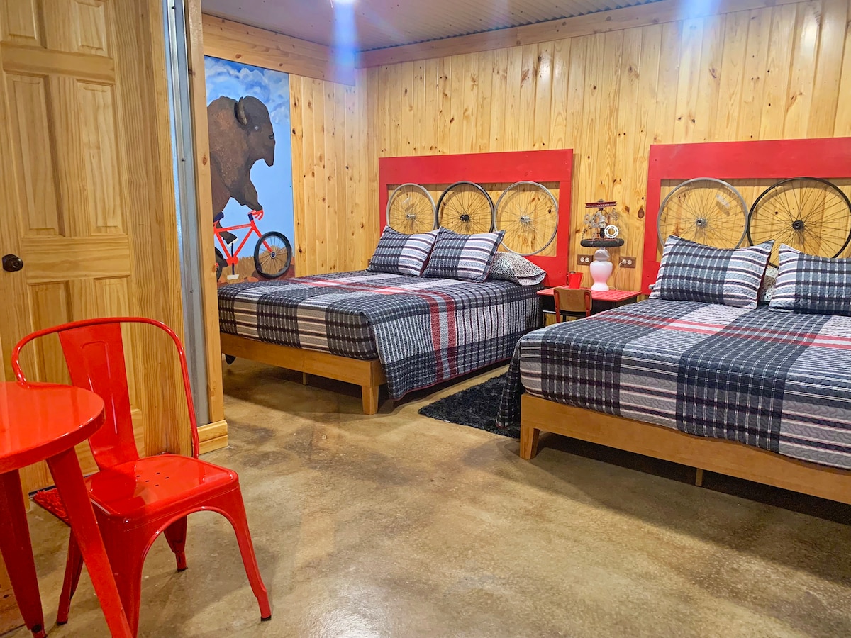 После захватывающего дня катания по тропам сбросьте обувь и зарядитесь энергией в нашем домике Tour de Bison. Велосипедный декор вдохновит вас на знакомство с 26-мильными велосипедными дорожками в горах Уичито, которые предлагают уникальные возможности для наблюдения за дикой природой. Поднимитесь на вершину горы Скотт в 3 милях? Расположенный у подножия гор Уичито, The Lazy Buffalo имеет 13 индивидуальных тематических домиков. Тур де Бизон на 4 спальных места с 2 кроватями размера Queen size.