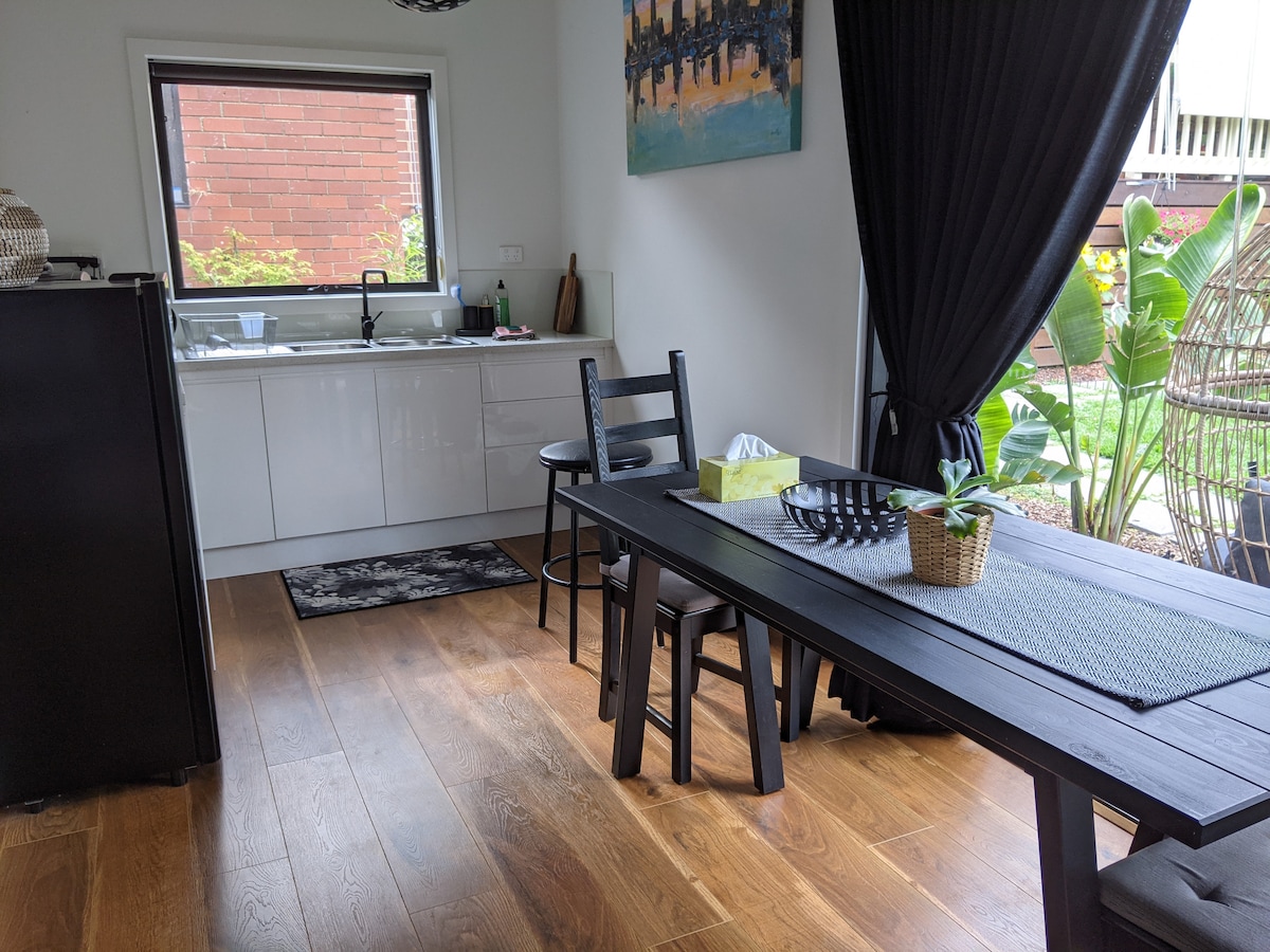 Это новое и современное бунгало находится всего в 3 км от Центрального делового района Мельбурна с собственным входом. Это оазис спокойствия и умиротворения. Неподалеку находятся монастырь Эбботсфорд, детская ферма Коллингвуд и река Ярра с пешеходными дорожками, водопадом, общественным полем для гольфа, кафе и ресторанами. Железнодорожный вокзал находится в 5 минутах ходьбы, откуда можно добраться до Центрального делового района Мельбурна и всех спортивных и культурных мероприятий. Выбор бесконечен. Мы предлагаем бесплатную кашу, хлопья, чай и кофе в капсуле.