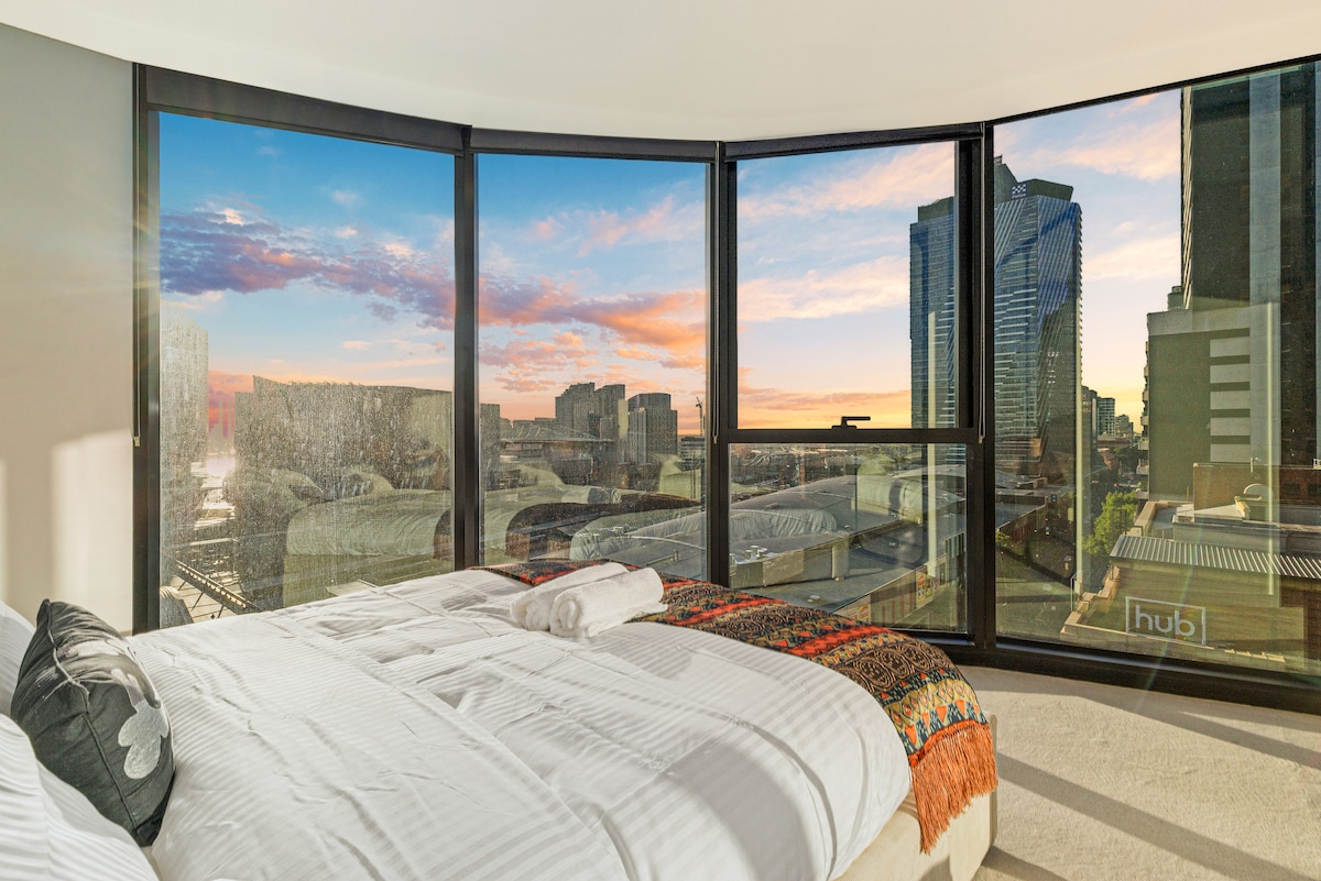Flexible early check in and late check out- stay as late as you need! AMAZING CITY VIEWS, The balcony is a perfect place to enjoy the New Years Fireworks . Centrally located, across the road from Southern Cross Station, step out from the train or Skye bus. DFO and Coles Supermarket across the road and Crown Casino a short tram ride. Bottle of wine and treats on arrival. World class resort style facilities including 25m lap pool, a fully equipped gym, sauna, rock climbing wall.