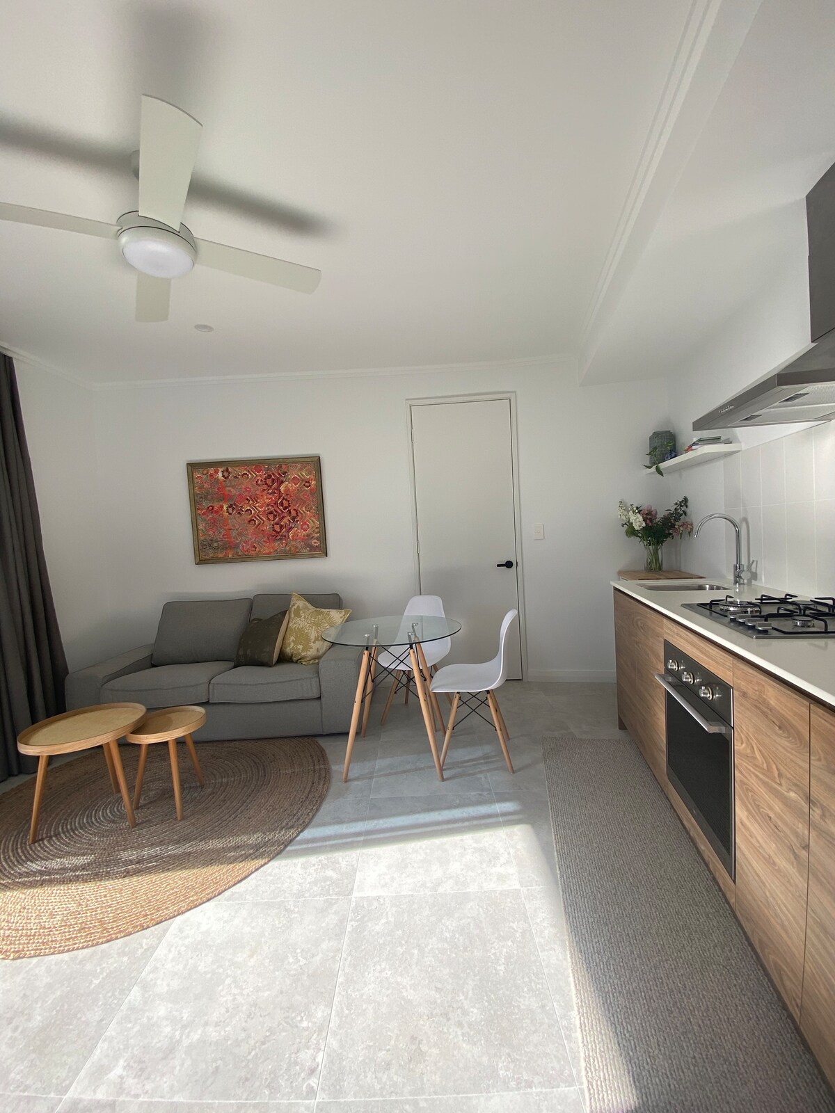 Самостоятельная студия свежая и светлая с хорошо оборудованной кухней с микроволновой печью, газовой варочной панелью и мини-духовкой. Предоставляется базовый завтрак. Ванная комната компактная с душем, полотенцесушитель с подогревом и фен. В студии есть кондиционер с обратным циклом, интернет, смарт-телевизор с Netflix. Он отделен от дома, и ваша конфиденциальность гарантирована, так как 1,8-метровый забор разделяет их. Перед студией есть собственная гостиная с барбекю.