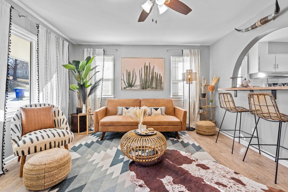 🌿 Boho Lounge: Канзас-Сити 🏡 3 спальни • 2 ванные комнаты • 7 спальных мест ✨ Недавно отремонтированное жилье с двумя гостиными + рабочее пространство. 🍳 Полностью оборудованная кухня с приборами из нержавеющей стали и кофе-баром. 🔥 Собственный внутренний дворик, костровище и две зоны отдыха на открытом воздухе. 🛏️ Кровать размера King size + 2 кровати размера Queen size + раскладной диван 🧴 Роскошные банные принадлежности и стиральная машина в доме. 🚗 Частная парковка на 4 машины. 📍 В нескольких минутах от центра Канзас-Сити, Оверленд-Парка, Шони и Ленексы