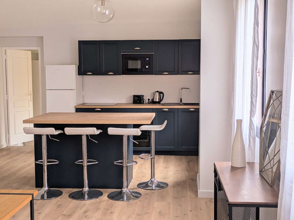 В центре города, в 2 шагах от нашего уникального средневекового зала во Франции по качеству его архитектуры. Таунхаус или гостиная расположены наверху. Светлые комнаты. К вашим услугам оборудованная кухня (духовка, посудомоечная машина, микроволновая печь, холодильник с морозильной камерой). Красивый главный люкс с односпальной кроватью в алькове, который можно использовать в качестве скамейки для чтения или спальной зоны для детей. Вторая спальня с двуспальной кроватью. Санузел с душевой кабиной.