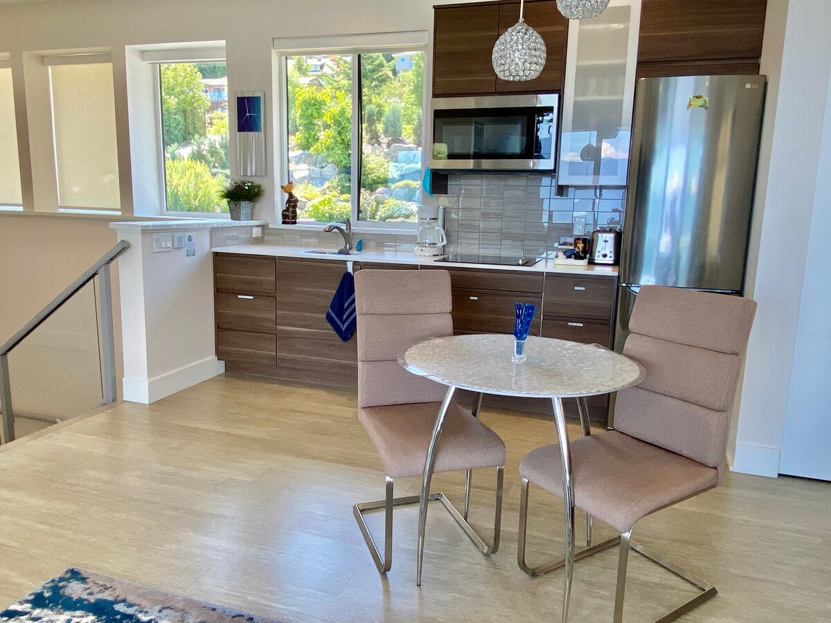 Современная, светлая квартира-студия в подвале с кроватью размера Queen size и диваном-кроватью. Полностью оборудованная мини-кухня с варочной панелью, микроволновой печью, чайником, посудой и столовыми приборами. Отдельная ванная комната с большой душевой кабиной и стиральной машиной/сушилкой. Расположена в тихом районе недалеко от SFU — легко добраться пешком, на общественном транспорте или на машине. Всего 30 минут до центра Ванкувера на машине или 45–60 минут на общественном транспорте. Чисто, комфортно и со всем необходимым. Примечание: мы любим домашних животных, но мы НЕ разрешаем кошек.