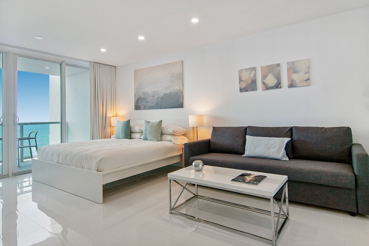 Добро пожаловать в Pure Miami Beach! Откройте для себя современную пляжную студию в солнечном Майами-Бич, штат Флорида, с захватывающим видом на океан на 180°. Расслабьтесь в роскошной двуспальной кровати размера King size, трансляцию на 65-дюймовом 4K-телевизоре Samsung или работайте с частным Wi-Fi 300 МБ и подключением Ethernet. Оставайтесь в форме в отремонтированном тренажерном зале, а затем расслабьтесь у сверкающего бассейна с прямым выходом на пляж, шезлонгами и тики-баром для тропических напитков и закусок. Бесплатная парковка, роскошная отделка и бесконечная атмосфера океана делают этот отдых незабываемым!