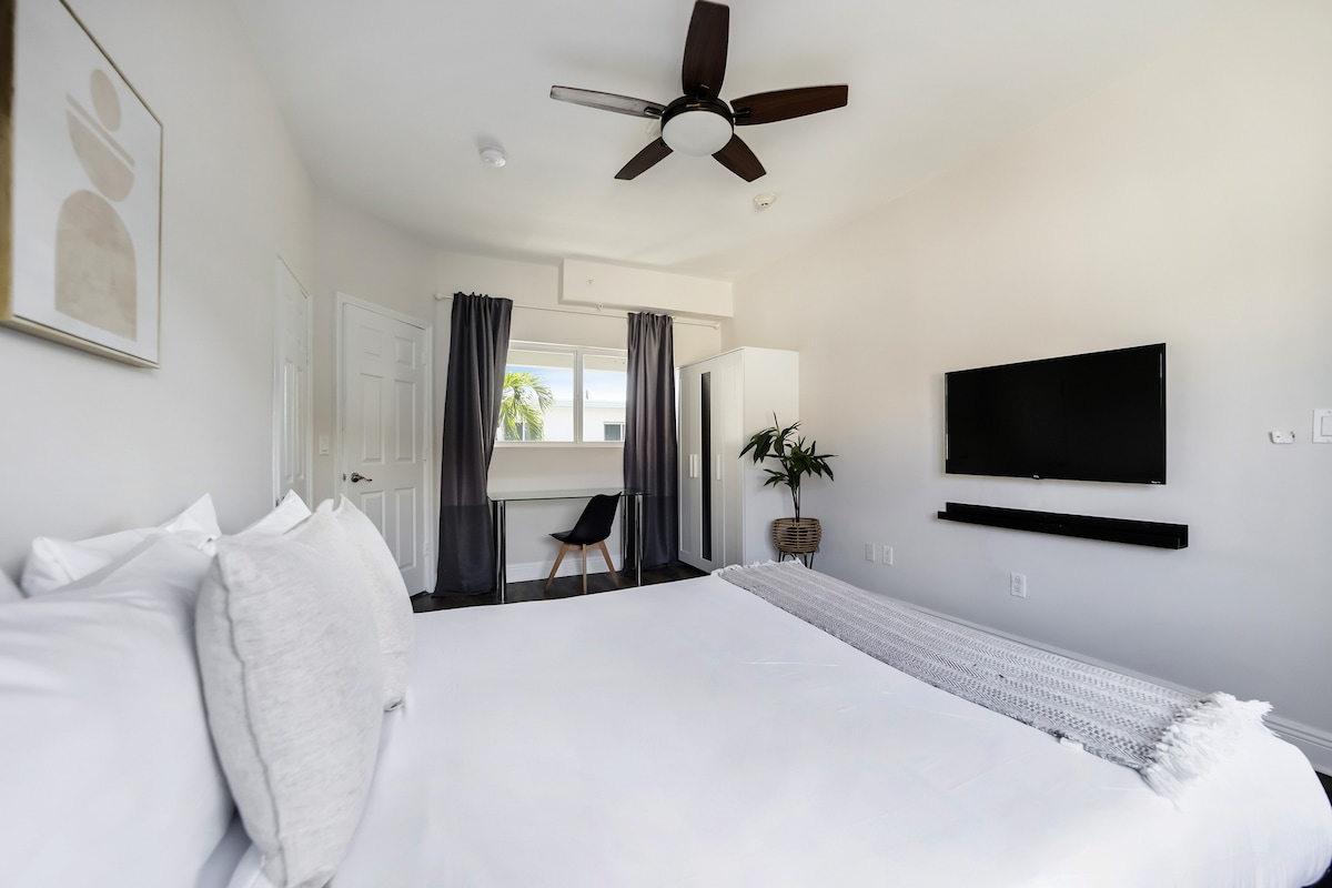 Добро пожаловать в Pure Miami Beach! Откройте для себя современную пляжную студию в солнечном Майами-Бич, штат Флорида, с захватывающим видом на океан на 180°. Расслабьтесь в роскошной двуспальной кровати размера King size, трансляцию на 65-дюймовом 4K-телевизоре Samsung или работайте с частным Wi-Fi 300 МБ и подключением Ethernet. Оставайтесь в форме в отремонтированном тренажерном зале, а затем расслабьтесь у сверкающего бассейна с прямым выходом на пляж, шезлонгами и тики-баром для тропических напитков и закусок. Бесплатная парковка, роскошная отделка и бесконечная атмосфера океана делают этот отдых незабываемым!