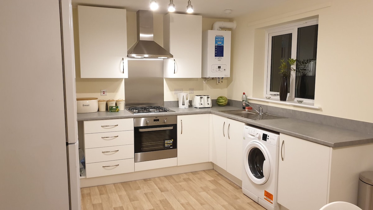 КУХОННЫЙ УЖИН: хорошо представленная кухня оборудована выбором посуды, кастрюль, сковородок и всей бытовой техники, которая вам понадобится для вашего пребывания. ГОСТИНАЯ: стильная и современная гостиная расположена на первом этаже и состоит из 1 большого дивана. В номере также есть телевизор со Smart-TV. СПАЛЬНЯ: обе с двуспальными кроватями. В ВАННЫХ КОМНАТАХ: недавно оборудованная душевая. ОСОБЕННОСТИ НА УЛИЦЕ: большой частный сад с сиденьями. Парковка на дороге.