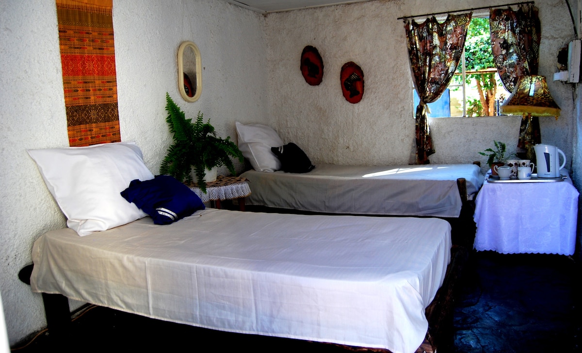 Bulawayo's best spot is super close to town and has a lush garden and secure living area. You’ll love my place because of the outdoors space. Highly recommended for couples, solo adventurers, business travelers, and families (with kids). Equippped with solar lights and geyser, in the event of power cuts as well as a gas stove.