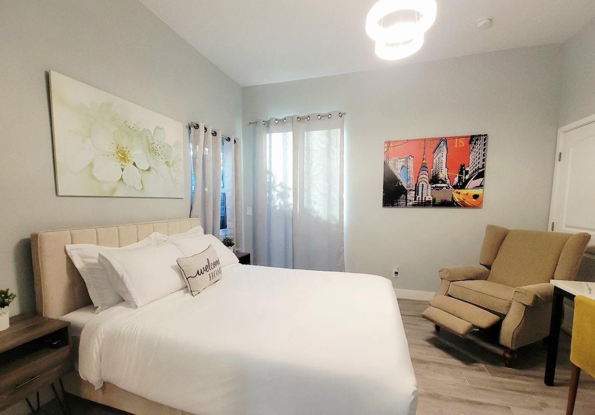 Добро пожаловать в уютный гостевой люкс с 1 спальней и 1 ванной комнатой, полноразмерной кухней, полностью укомплектованной всем необходимым для домашнего приготовления пищи. Этот стильный отель расположен в безопасном и тихом районе и идеально подходит для пар или одиночных путешественников, ищущих комфорт и удобство. Отказ от ответственности: квартира примыкает к главному дому, но имеет отдельный вход и парковку. Нет общих помещений. Офисный стол заменяется диваном-кроватью.
