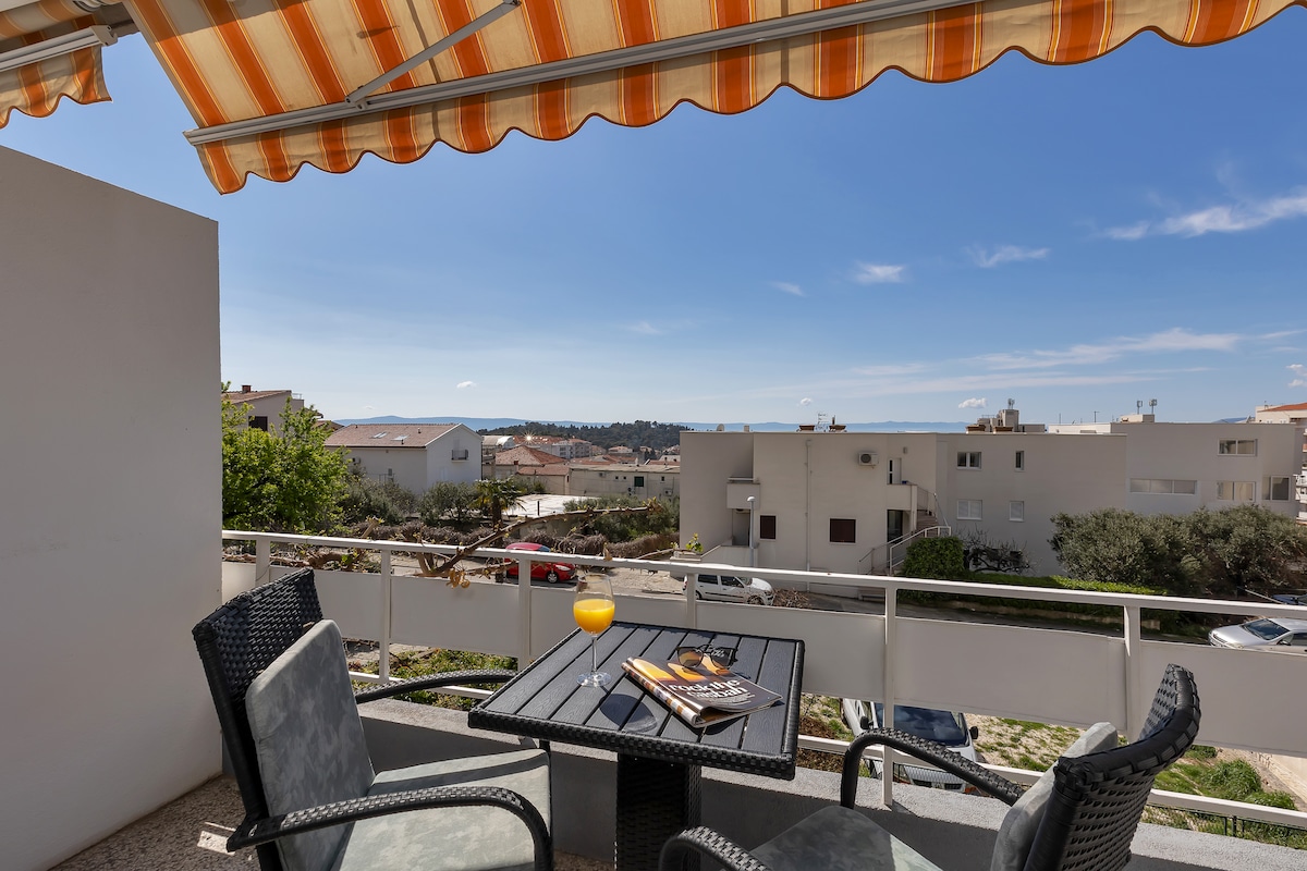 Квартира площадью 60 м 2 состоит из спальни с большой двуспальной кровать, ванной комнаты, просторной гостиной с кухней, прихожей и балкона. Вся южная стена в море находится в стекле, поэтому в помещении много света, и с балконом составляет одно пространство. Квартира расположена на третьем этаже дома, который находится недалеко от центра города (5 минут приятной прогулки вдоль моря), а с балкона открывается открытый вид на море и острова, так как дом расположен в первом ряду у моря.