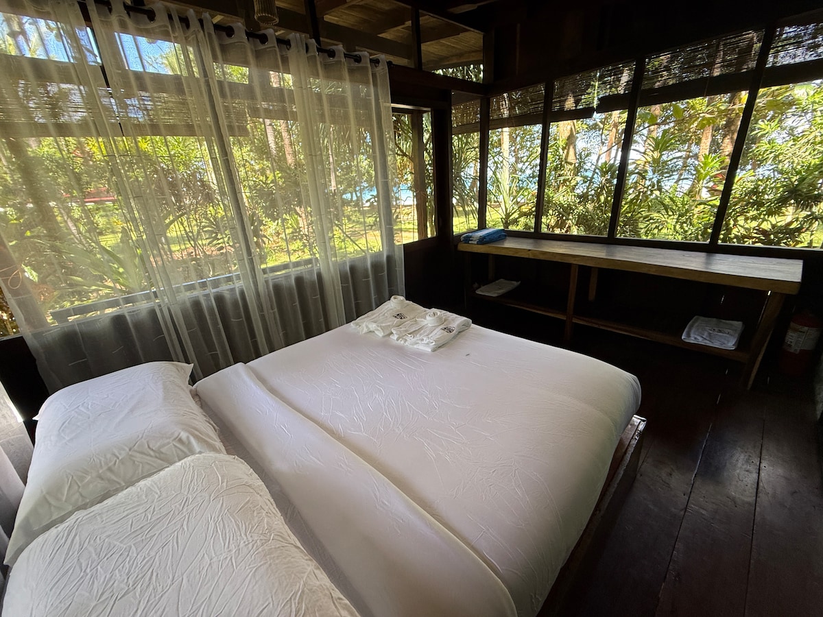 Отдохните в нашем бамбуковом домике, идиллическом уединении на берегу нетронутого пляжа, где каждый момент обещает потрясающие виды и непревзойденный отдых. Это очаровательное святилище сочетает в себе природную красоту с современными удобствами, предлагая вам незабываемые впечатления от пляжа. Наслаждайтесь ванной комнатой, кондиционером, телевизором, холодильником, холодильником и молниеносным интернетом 200 Мбит/с. В нашем доме есть бар, ресторан, бассейн для брызг, снаряжение для сноркелинга.