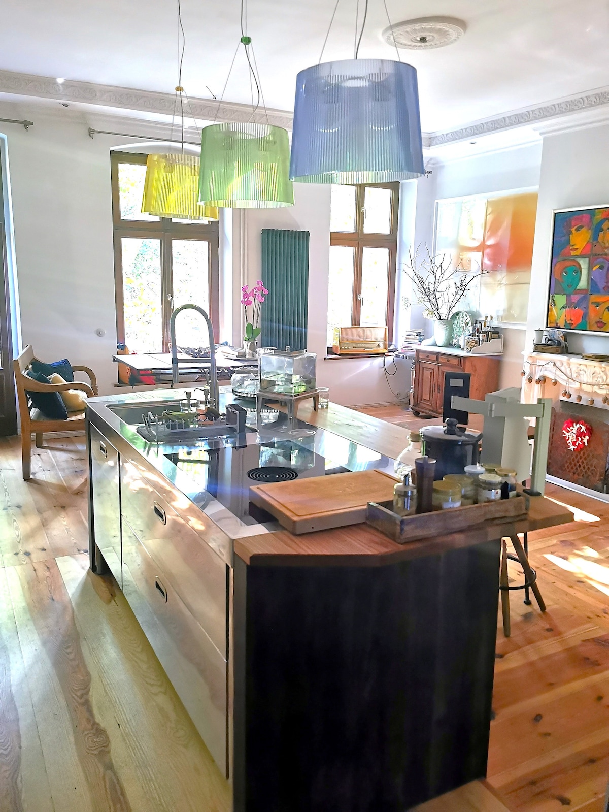 Красивая квартира площадью 160 кв. м (или 1700 кв. футов) в старом здании с лепниной и высокими потолками рядом с главным вокзалом в центре Берлина (район Берлин-Митт). Красиво отремонтированная кухня/гостиная с длинным столом идеально подходит для дружеских встреч. Wi-Fi, постельное белье, банные и ручные полотенца, удобное для кожи мыло, зеленый газ и электричество включены. Никаких дополнительных сборов. Мы любим семьи - дети до 12 лет бесплатно.