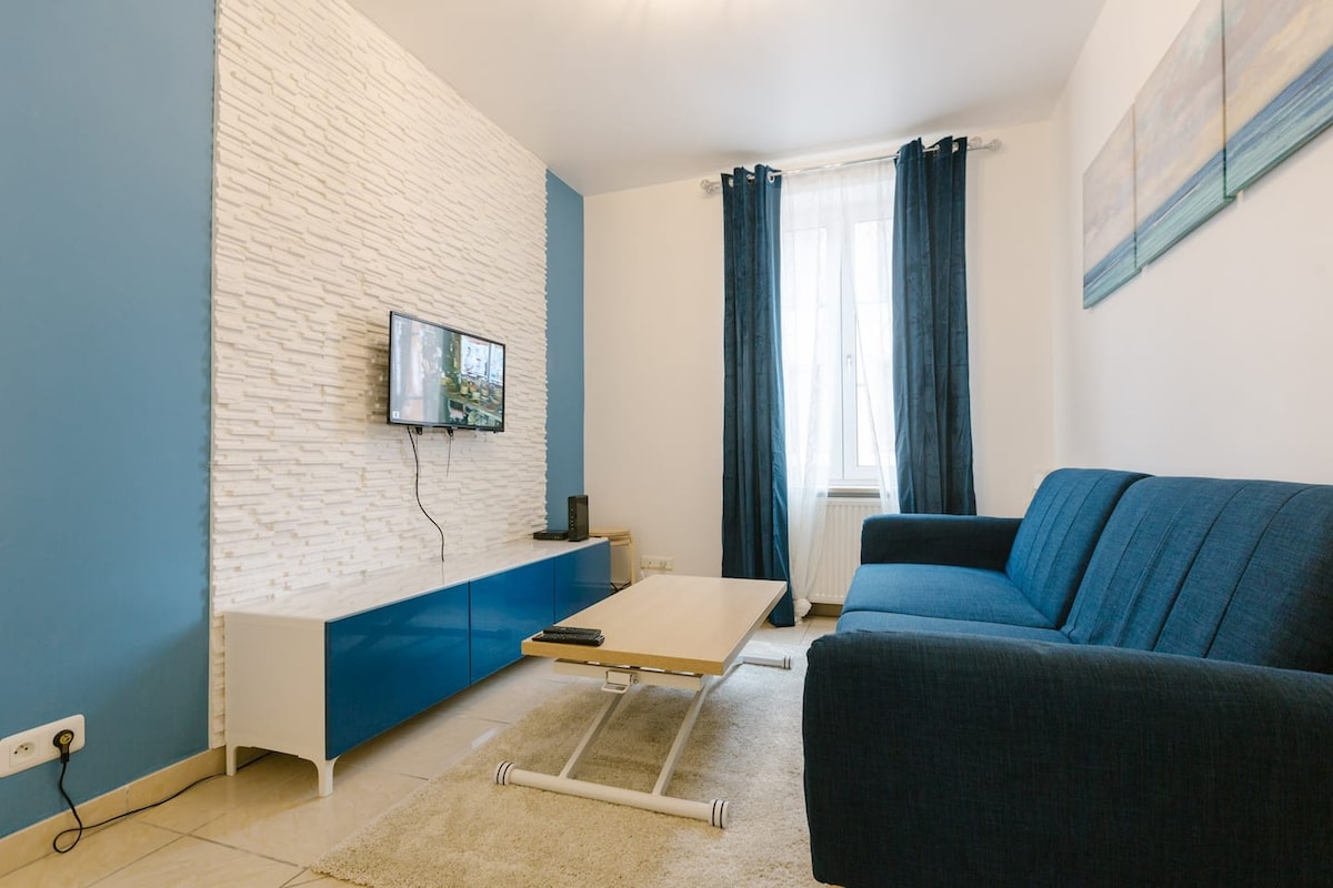 Стильная квартира площадью около 70 кв. м со всеми удобствами, необходимыми для приятного отдыха. Жилье расположено на первом этаже многоквартирного дома из 3. Состоит из: - кухни, оборудованной всем необходимым для приготовления пищи. - уютный лаундж с телевизором; - полностью оборудованная ванная комната; - Две спальни расположены в: - 18 минут на автобусе и трамвае. - 10 минут езды от центра Страсбурга; Магазины поблизости (пекарня, магазин...) До бесплатной парковки можно дойти пешком.