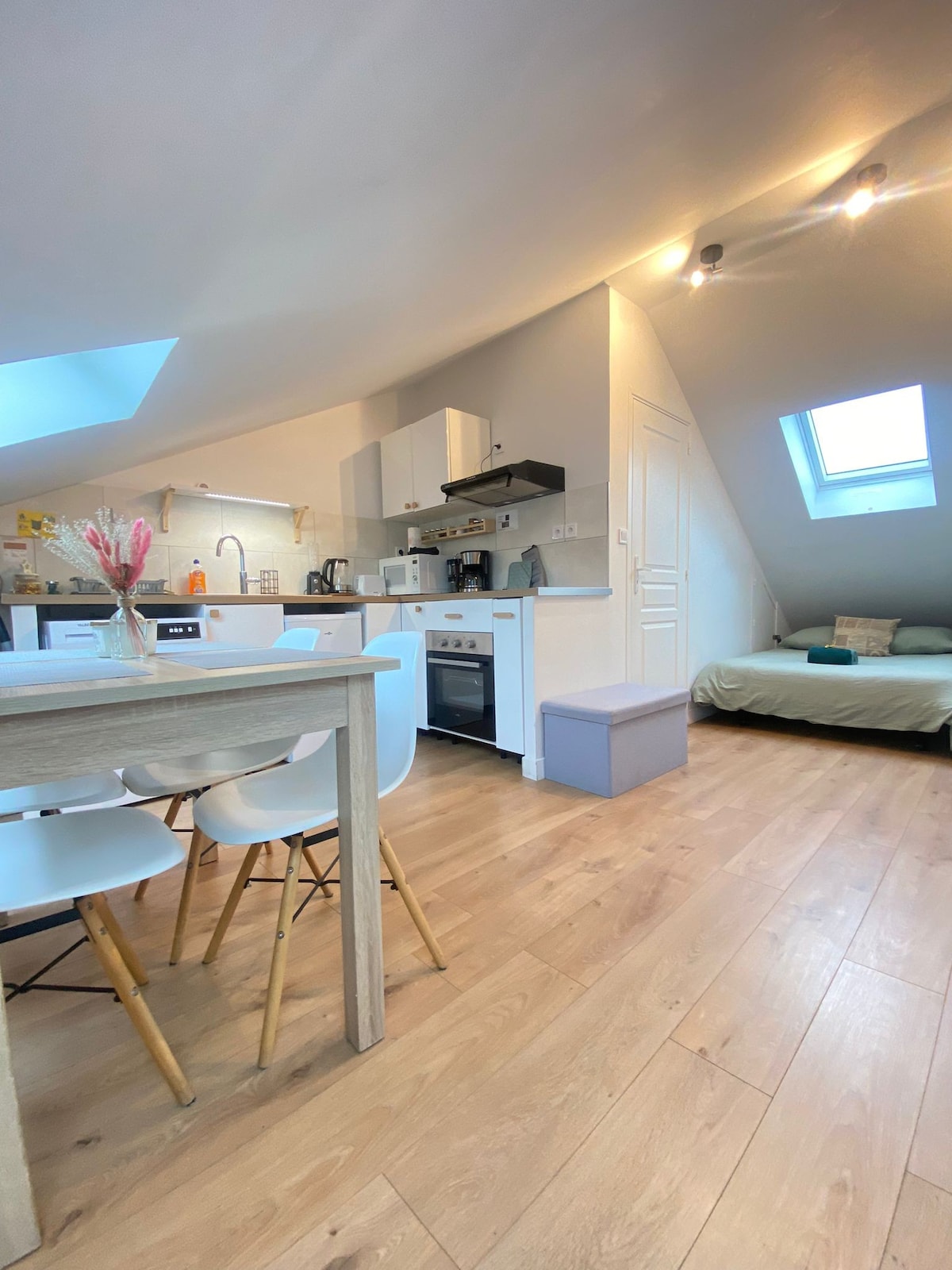 Очень хорошая тихая квартира, рядом с центром города Эперне. Вы найдете красивое жилое пространство с полностью оборудованной кухней, гостиной с диваном-кроватью (дополнительно) и телевизором. Отдельный туалет. Главная спальня оборудована кроватью 160x200, выходящей в душевую. Вторая спальня, общаясь с первой (внимание, нет двери между 2 спальнями), оборудованная раскладной кроватью и шкафами, которые подходят для детей. Реверсивный кондиционер в квартире.