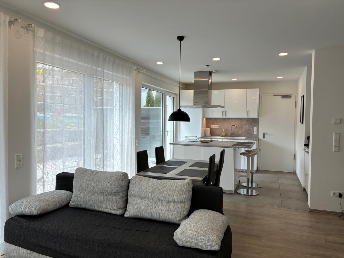 Современный дизайнерский деревянный дом с фантастическими видами на виноградник и видами на Ремстал. Квартира расположена на первом этаже отдельного дома отдельного дома и имеет отдельный вход в квартиру снаружи. В 15 минутах езды от Штутгарта-Митте и в 20 минутах езды от S-Bahn. Квартира. Удобства оборудованы качественной мебелью. Открытая кухня, обеденная зона. Очень большая открытая терраса приглашает вас задержаться. Есть все удобства в квартире.