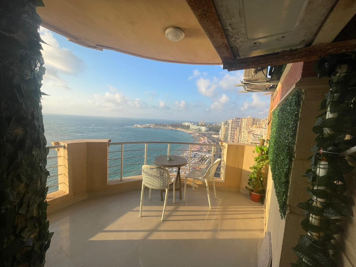 Stunning beachfront apartment with panoramic sea views in the heart of Alexandria, on the 15th floor. Bright, spacious setting with modern amenities and a private balcony and beach access. The building offers 24/7 security and assigned parking. Steps from the beach and close to restaurants, cafés, and shops. Sleeps 6: • 3 bedrooms (2 king, 2 singles) • 2 bathrooms with showers • Large lounge, fully equipped kitchen • Fast WiFi, satellite TV, fresh linens •Fully air-conditioned •Elevator access