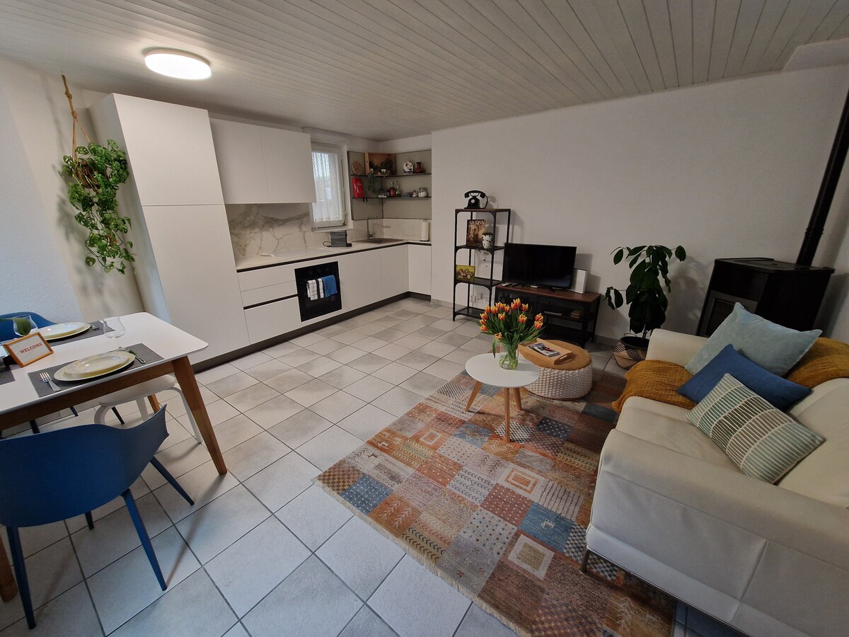 Квартира расположена на первом этаже. Очень яркий и гостеприимный. Оборудованная кухня. Доступна кофемашина Nespresso с 10 бесплатными капсулами. Сад, общий с владельцами. Гамак и гриль пригодны для использования. Ситуация: квартира расположена в очень тихом районе; общественный транспорт и супермаркеты всего в нескольких минутах ходьбы. До деревни Аскона можно дойти пешком за 15/20 минут.