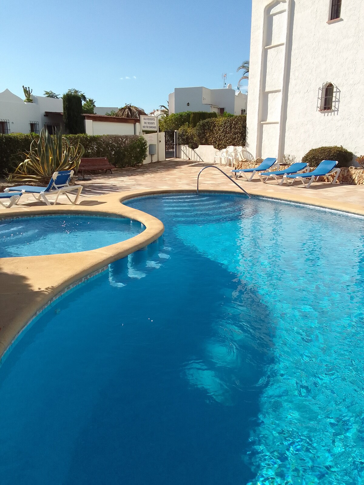 Kick back and relax in this calm, stylish space. Situated on a beautifully kept, quiet complex in a very sunny position to enjoy all year round sun. Fully equipped kitchen, spacious lounge leading to lovely outside terrace, 2 large bedrooms and stunning bathroom. hot and cold air conditioning, fast WiFi, smart TV with full TV viewing, lovely communal pool in a quiet complex, located close to the 5* Swiss Hotel and walking distance to Bar 21 Bistro, 2 minutes drive to Moraira Village.