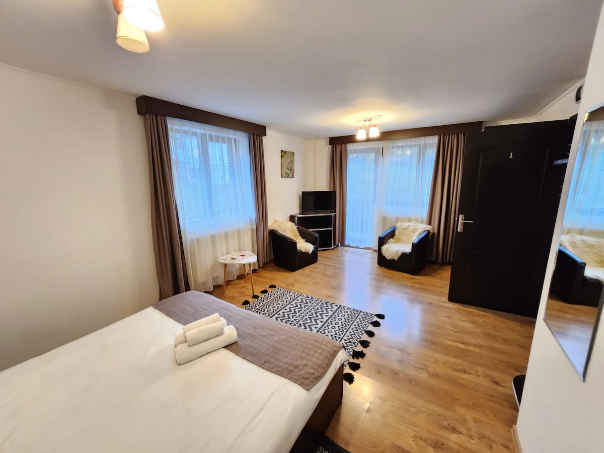 Вилла,винтажная квартира с 2 комнатами,рекомендуется для семей с детьми или 4 человек, 1 раскладной диван (2 человека) и 1 двуспальная кровать, ванная комната с душем, столовая, сад и барбекю, доступ к кухне со всей необходимой техникой! Лыжная школа для начинающих и продвинутых , расположение рядом с Peles Castel, в 5 минутах от станции канатной дороги, в 10 минутах от центра города (ресторан, клубы), бесплатная и безопасная парковка Ждем Вас с большим удовольствием!!!! Кофе БЕСПЛАТНЫЙ !!!