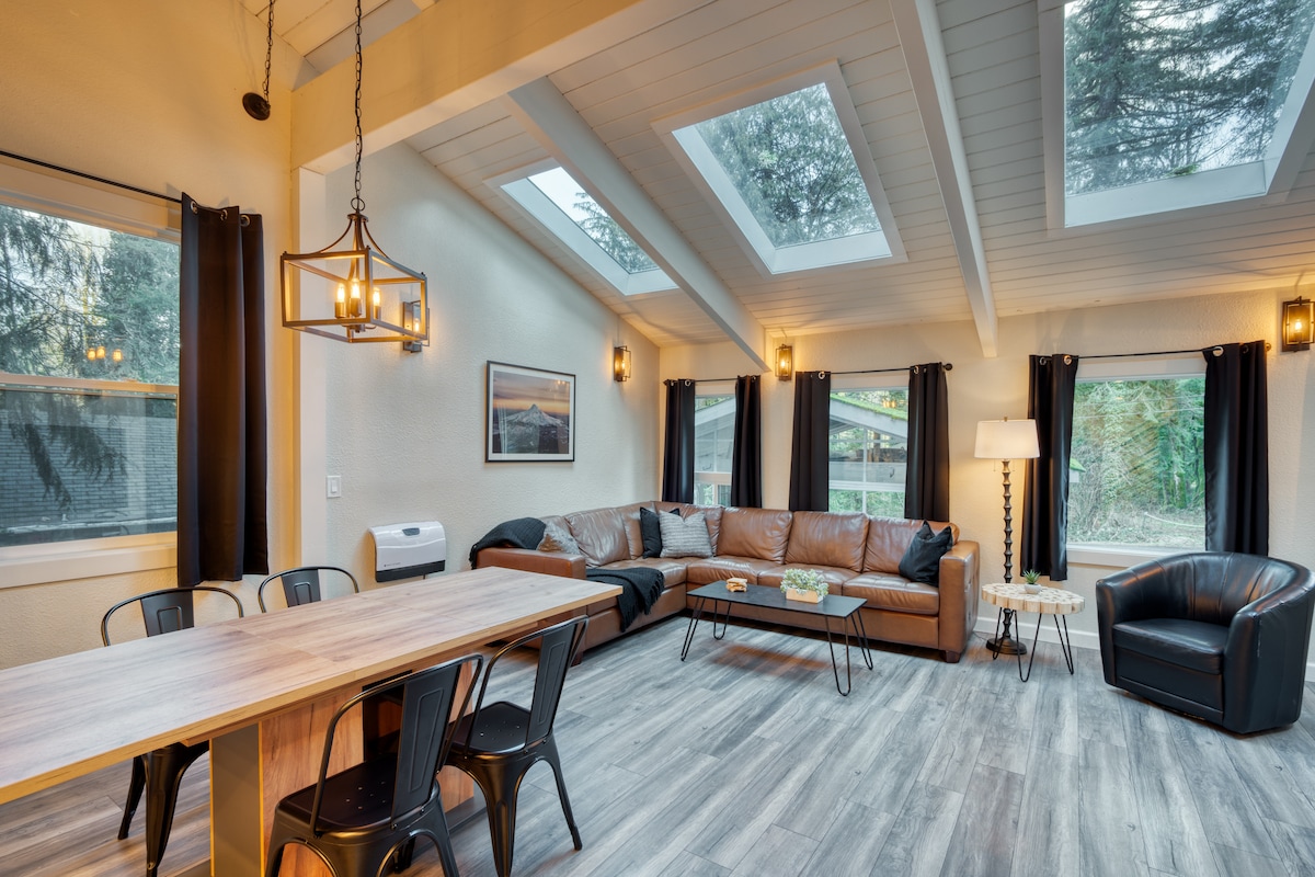 Добро пожаловать в наш потрясающий домик с двумя спальнями и двумя ванными комнатами, расположенный вдоль реки Сэнди. Насладитесь прямым доступом к реке, где можно насладиться природной красотой окрестностей и видом на гору. Капюшон. Гостиная с открытой планировкой может похвастаться большими окнами, которые обрамляют захватывающий вид на реку, создавая привлекательную атмосферу, которая идеально подходит для отдыха. Побалуйте себя сауной с панорамным видом на реку. Хижина находится недалеко от бесконечных развлечений на горе Худ.