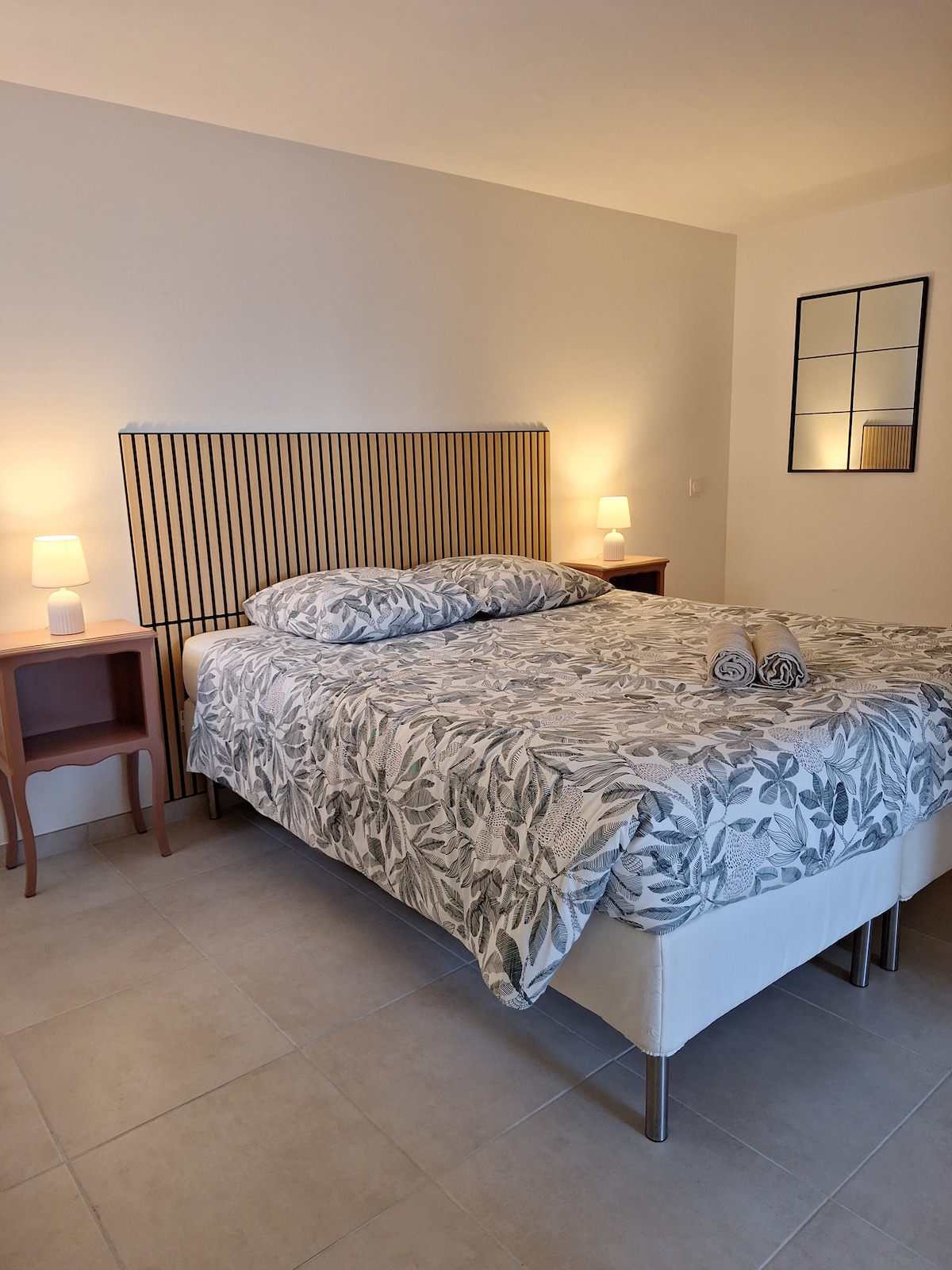 Dans propriété, en annexe : logement de type 2 avec entrée indépendante et stationnement privatif clos . Pièce de vie avec TV ,canapé-lit (Clic-clac 1 personne maxi) cuisine équipée, une chambre ( lit 2 pers), espace dressing avec salle de bain -wc . Draps et serviettes fournis. Sur demande draps pour le canapé , lit parapluie et chaise pour bébé . Terrasse privée avec salon de jardin , transats , parasol et plancha . Accès libre à la piscine partagée. Environnement calme et sans vis à vis.