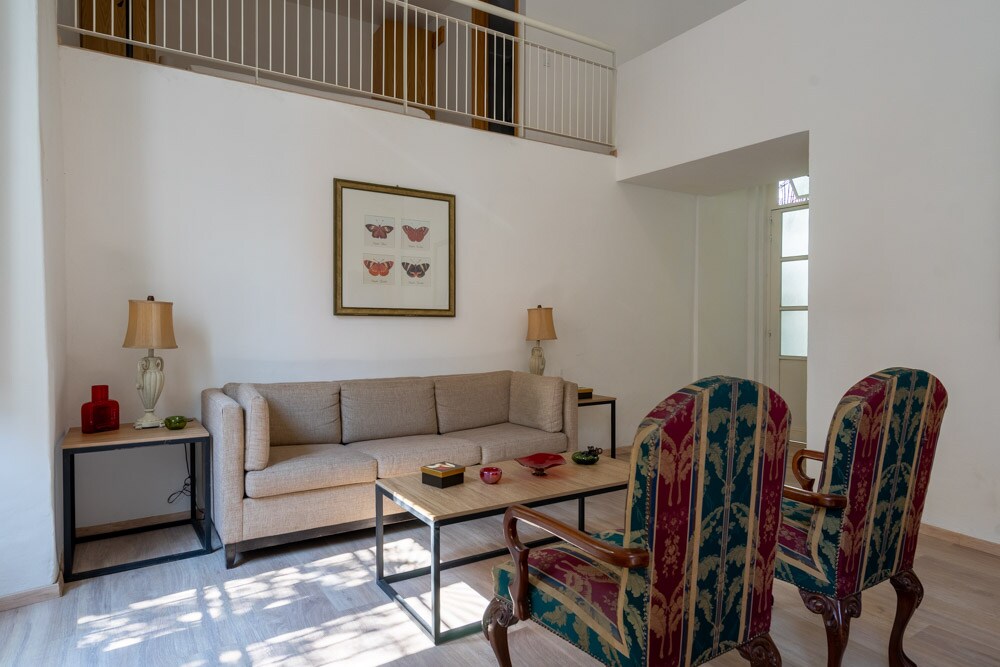 Premiere и наслаждайтесь колониальным лофтом в Casa Ilustre, в одном квартале от собора Гвадалахары и в двух кварталах от театра Деголладо и Пласа Тапатия. Идеально подходит для пар или одиночных путешественников, с гостиной, столовой, мини-кухней, спальней с кроватью размера King size, диваном-кроватью размера King size, Wi-Fi, Smart TV и собственной ванной комнатой. Отдохните на крыше с бассейном и насладитесь прекрасным видом на собор. Рядом с музеями, ресторанами, кафе, галереями, площадями и общественной парковкой за домом.