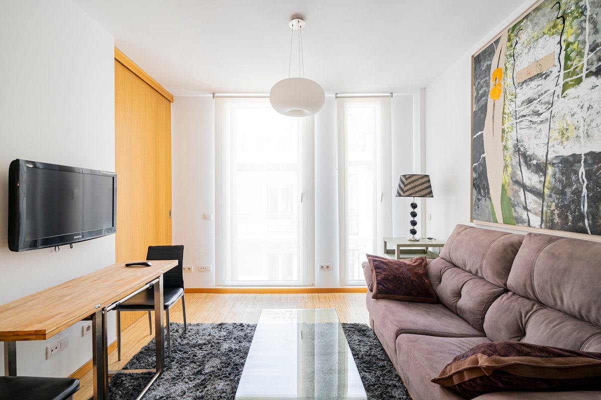 Великолепная квартира площадью 45 квадратных метров в центре Мадрида. Квартира с впечатляющим дизайном и декором, просторными зонами и высокими потолками оборудована всем необходимым для проживания в Мадриде. В гостиной три балкона с видом на улицу, которые обеспечивают отличную освещенность квартиры. В спальне есть собственная ванная комната и рабочий стол. Из квартиры можно дойти пешком до почти всех знаковых мест Мадрида.