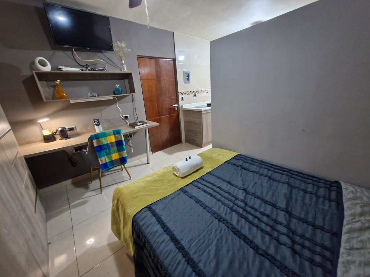 Studio room with terrace in downtown Monterrey. Modern and cosy. Enjoy the company of Alexa and her voice assistance. Control the lights in the room. Play all your music with Apple Music and enjoy entertainment with Netflix, HBO, AppleTV, and Amazon Prime. High-speed Wi-Fi. Private and with completely independent access. 15 minutes from the city's main attractions. In a quiet neighbourhood. Close to the Obispado/Chepevera/Centro area.