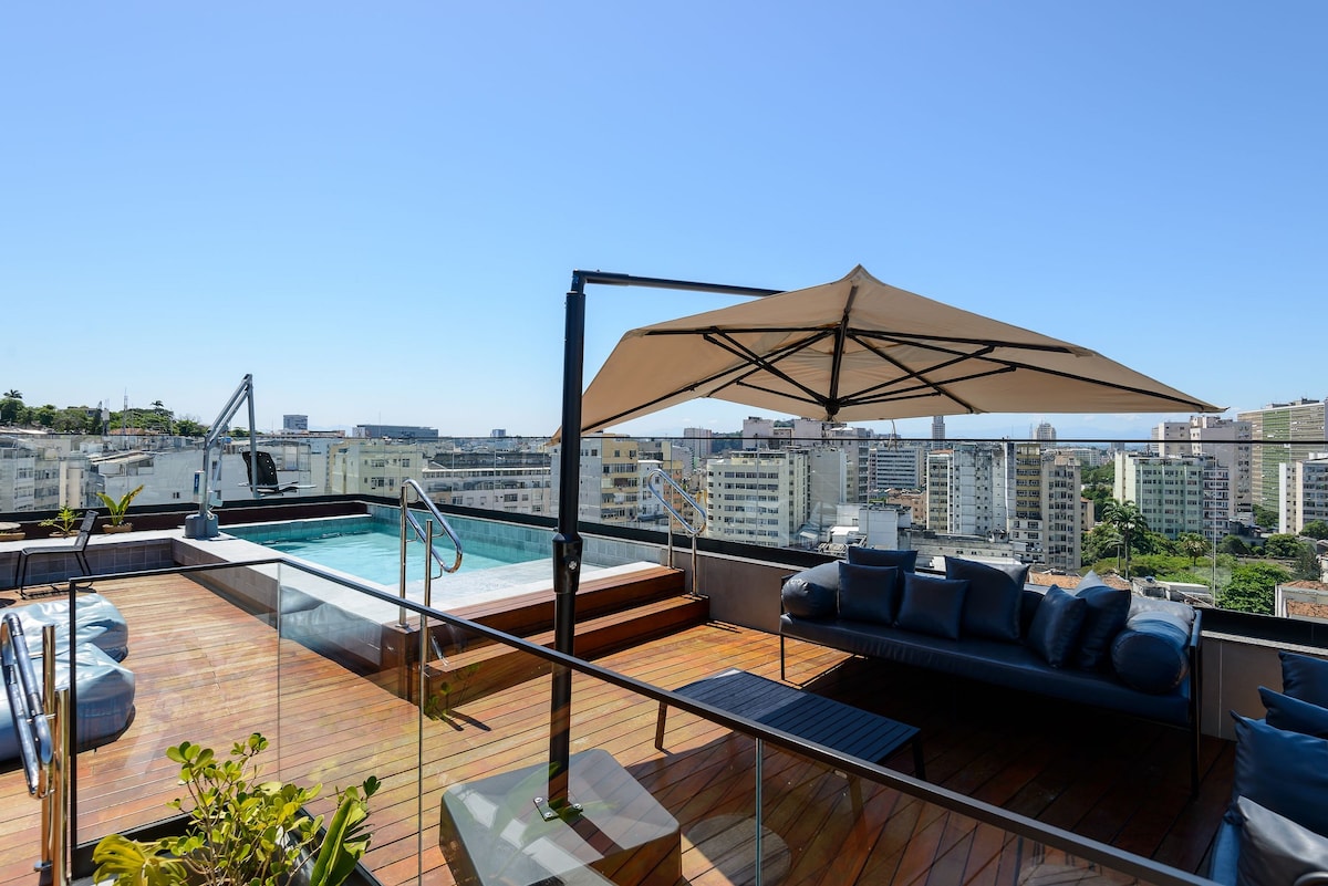 Просторный люкс гостей в пентхаусе с прекрасным видом на Христа-Искупителя и лагуну Родриго-де-Фрейтас. К услугам гостей большая открытая зона с бассейном с подогревом и водопадом, умывальник, парная с душем, кухня, барбекю, холодильник, варочная панель, микроволновая печь, аэрофритюрница и кухонная утварь. В номере есть независимый. Люкс находится в двух шагах от велосипедной дорожки Rodrigo de Freitas Lagoa, в пяти минутах ходьбы от Ботанического сада, в 10 минутах езды от Копакабаны, пляжей Леблон и Ипанема.