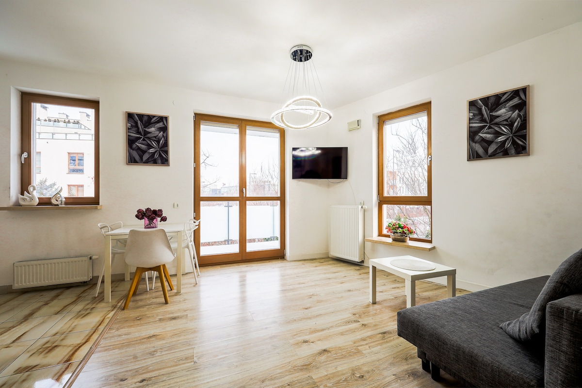 Komfortowy, w pełni wyposażony apartament w nowym budynku. Salon z otwartą kuchnią podzielony na część jadalną i wypoczynkową. W sypialni znajduje się duże łóżko i przestronna szafa. Jest także garderoba jako dodatkowe miejsce do przechowywania. W okolicy znajdują się sklepy, restauracje i kawiarnie Wyposażenie: klimatyzacja, ekspres, czajnik, żelazko, deska do prasowania, pralka Dojazd z Lotniska Chopina 20 min taxi 50 min komunikacja z Lotniska Modlin 50 min taxi 120 min komunikacja