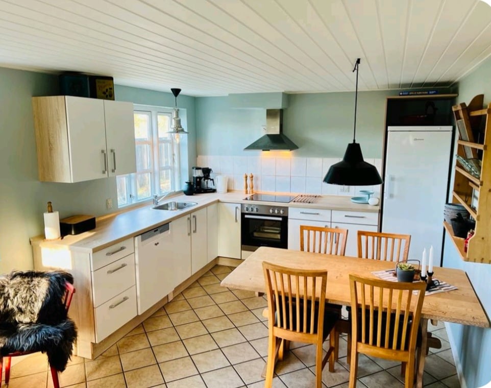 Очаровательный ретро-коттедж с захватывающим видом на море. Насладитесь закатом над дюнами из открытой кухни. Большие окна обеспечивают свет, видимость. Или расслабьтесь в холодный зимний день перед дровяной печью и посмотрите на бушующее Северное море. Гостиная с уютными спальными нишами, вкл. вид на океан. 2 спальни, ванная комната и лофт с местом для 2 дополнительных гостей. Примечание: цена не включает уборку: 700 датских крон при проживании более 3 дней, 500 датских крон при проживании менее 3 дней. Оплачивается при выезде.