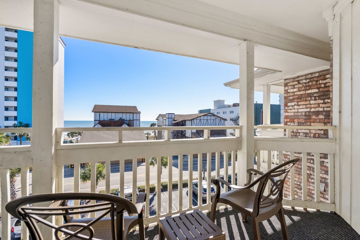Enjoy the perfect Myrtle Beach location at The Chelsea, just steps from the beach and minutes from Broadway at the Beach and the Boardwalk. -1st-floor condo with natural light & ocean-facing balcony -Open floor plan with living/dining areas -Primary suite: full + twin beds, en-suite bath, private balcony -2nd bedroom: full + twin beds, back balcony with pool view -55" TV, queen sleeper sofa, additional seating for 6 -Direct access to pool & hot tub deck from back balcony