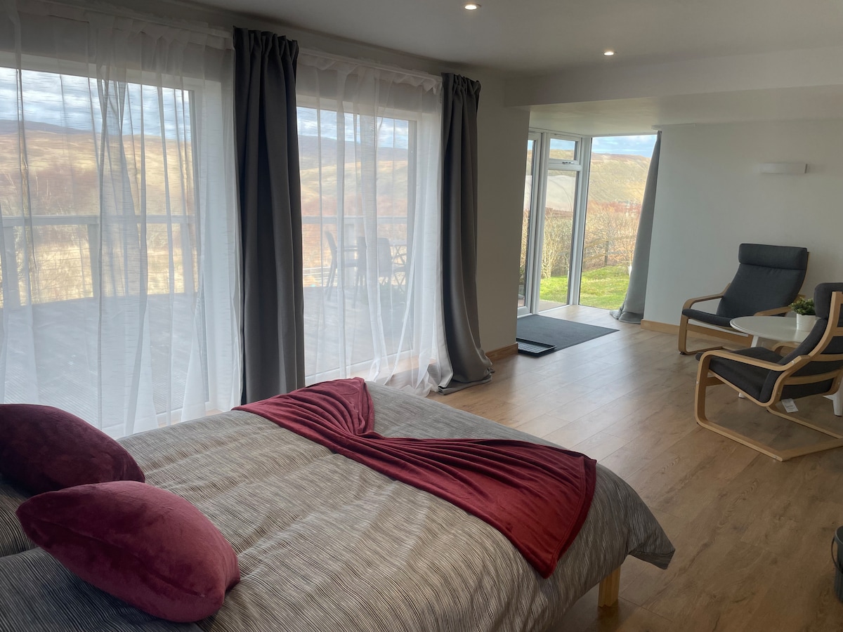 Семейный люкс Cnoc hol с 2 спальнями и собственным входом с 2 спальнями и собственным входом. Перед домом и парковкой есть сад. Кухни нет, но мы предоставляем континентальный пакет для завтрака. Wi-Fi и смарт-телевизоры в каждой спальне. Красивый вид в тихом районе. Мы находимся в 3 милях от Uig, где есть магазины, рестораны, кафе и еда на вынос, а также паромный терминал Uig для посещения внешнего острова. Мы находимся в 15 милях от Портри, который является оживленным городом