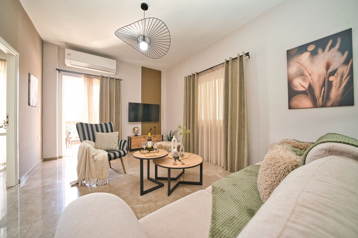 SYRIOS House & Apartments Newly renovated modern 100m² apartment close to the center of Nafplio. With three bedrooms and a full equipped kitchen with oven, microwave, coffee machine, toaster, boiler etc. A big living room with a big sofa, sofa bed and a 65" smart tv. Big bathroom with towels, papers, shampoo, conditioner and shower gel. Everything you need is close to the apartment (supermarket,pharmacy,café, bakery, shops etc.). Free and easy parking in the street.
