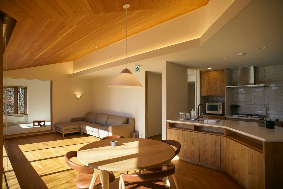Остановитесь в @Living Hutte°2, уютной вилле площадью 68 м² на высоте 1200 м в нетронутом нагорье Асама — чуть более 30 минут от Каруидзавы и Кусацу-Онсена. Окруженный красочными осенними лесами и зимними горнолыжными курортами со знаменитым японским порошковым снегом, это идеальное место для сезонного отдыха. Внутри вас ждет светлая гостиная-столовая, детали в стиле середины века и кухня в стиле кафе. После катания на лыжах отправляйтесь за покупками, в рестораны или на горячие источники Каруидзавы, а затем полюбуйтесь Млечным Путем с близкими.