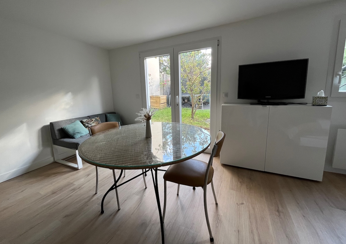🏠Приятная студия площадью 15 кв. м, отремонтированная в 2021 году на вилле в Чату. Спокойная и лесистая обстановка. Рядом с автобусными остановками. 👨🍳Полностью оборудованная кухня и микроволновая печь. Рабочее место с раскладным столом. Новый 3-местный диван-кровать от бренда Miliboo (матрас высокой плотности) 🛀Отдельная ванная комната и туалет. Очень высокоскоростной 💻Wi-Fi включен.