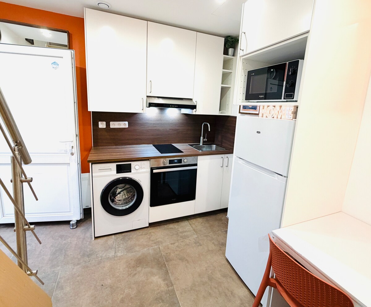 Квартира в 30 км от центра Парижа и в 18 км от Версаля Она расположена ниже нашего дома и имеет отдельный вход. Частная парковка, где несколько автомобилей могут припарковаться перед полностью отремонтированной меблированной террасой жилья. Двуспальная кровать (160 x 200 см) ЗАСТЕЛЕНА по прибытии. Смарт-телевизор Требуется подписка на Netflix, Amazon Prime, YouTube Кухня оснащена холодильником, чайником, кофемашиной Tassimo, микроволновой печью, плитой, посудой, раклетницей.